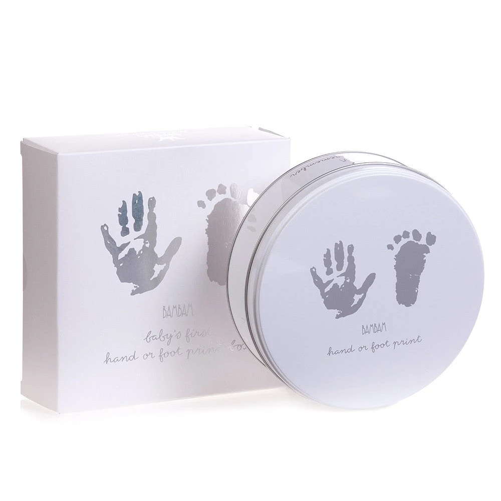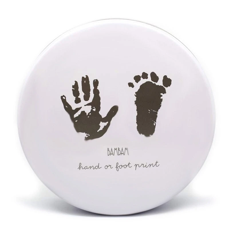 This creative baby hand and footprint kit comes in a stylish white cylinder tin. This is a perfect keepsake tin for keeping the hand or foot print safe forever. You can even write the name and date on the inside of the tin.