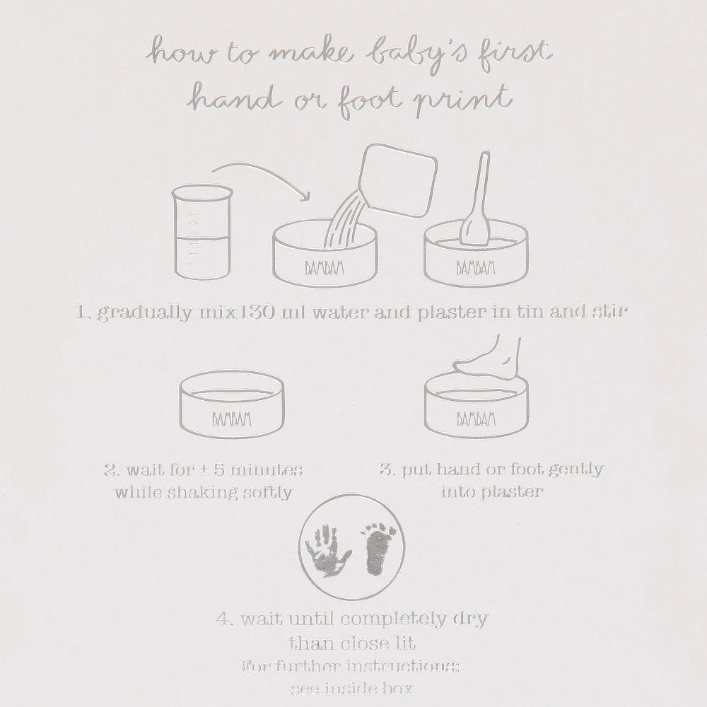 This cute hand and foot print kit (the tin, plaster and instructions) is presented in a lovely white gift box, with a silver hand and footprint on it, which makes a lovely baby shower present.