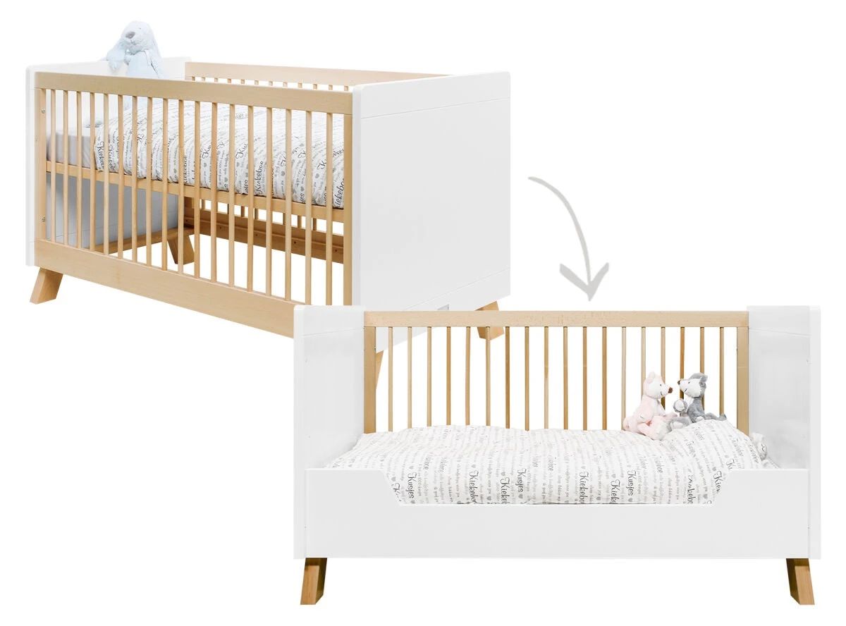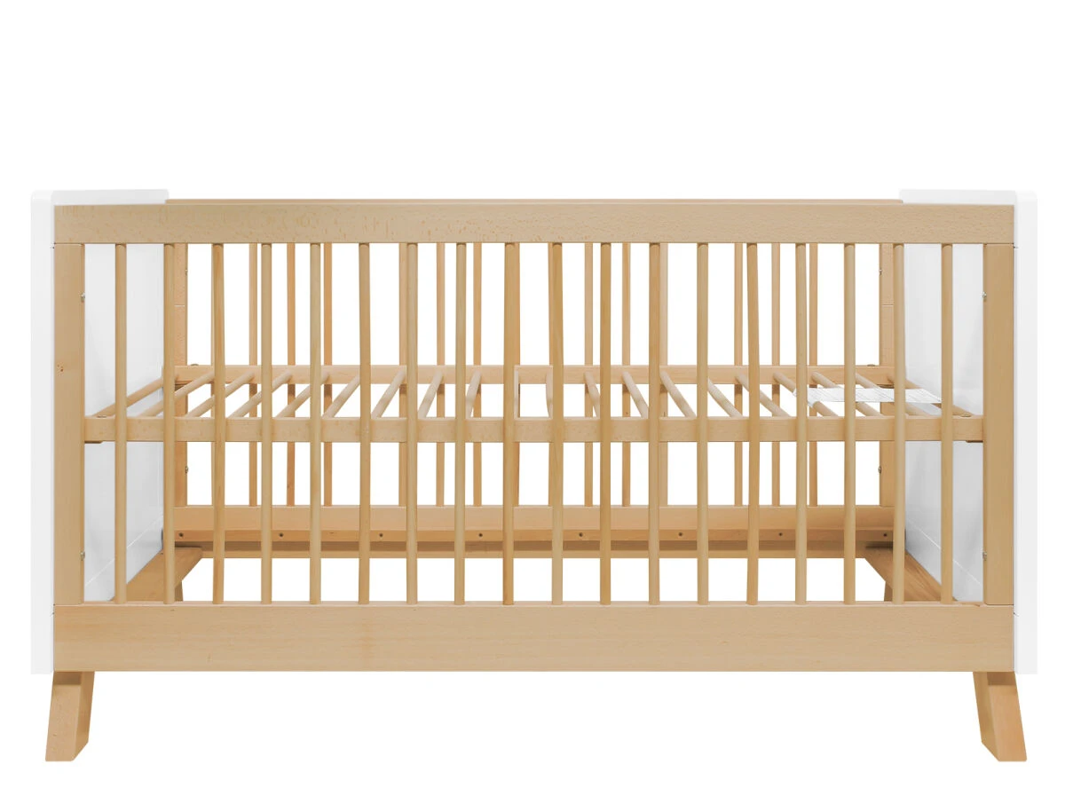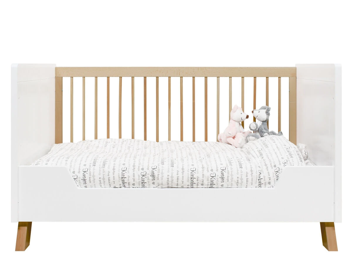This bed (70 x 140 cm) from the series Lisa can be converted from a bed with bars tot a bench bed. The bed is finished in a combination of white and natural lacquered beech wood. Bed bottom, side rack and lower side for the bench bed are included. Bed bottom of the bed with bars is adjustable in height. The size, 70 x 140 cm, is the same for both beds so that one mattress is sufficient. Note: this bed can not be converted to a cotbed variant, there is always one bar side.
