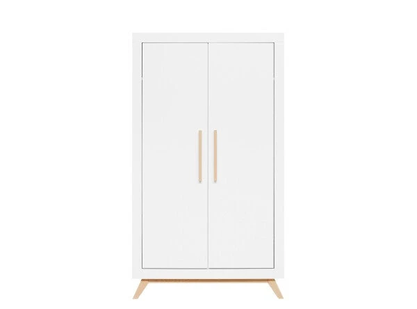Modern contemporary 2-door wardrobe from the Fenna series. In a combination of white and clear lacquered beech wooden accents. The interior consists of two fixed shelves, two hanging rods and four height-adjustable shelves.