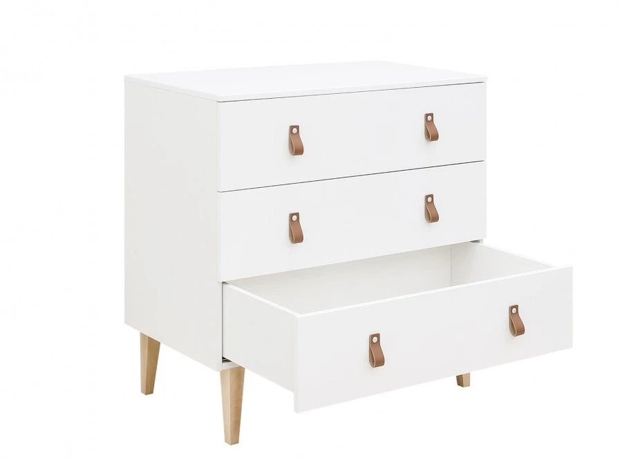Chest of drawers from the Indy series with 3 drawers with leather handles. The chest of drawers rests on slender beech legs. Can be combined with the barrier Uno and the wall rack of the Indy series.