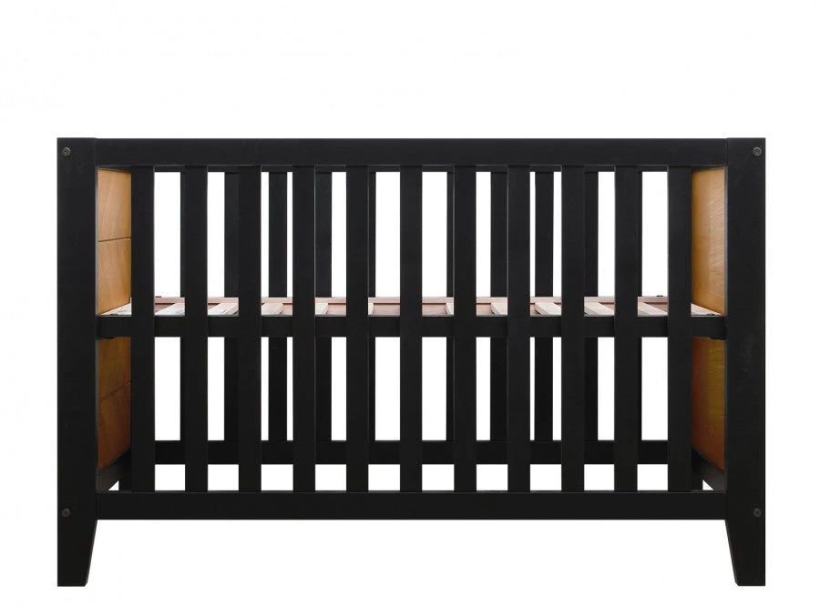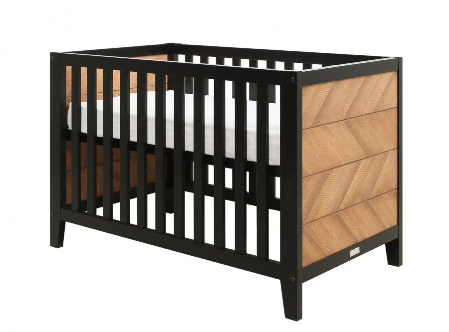 In a cool combination of matt black and veneered wood. The head and foot panels have a herringbone motif on one side. The bed base is adjustable in height, as soon as the baby can pull itself up you can lower the floor for extra safety. Combine this bed with the other furniture in the Job series. Since it is a natural product, the wood structure can differ per piece of furniture in the Job series.
