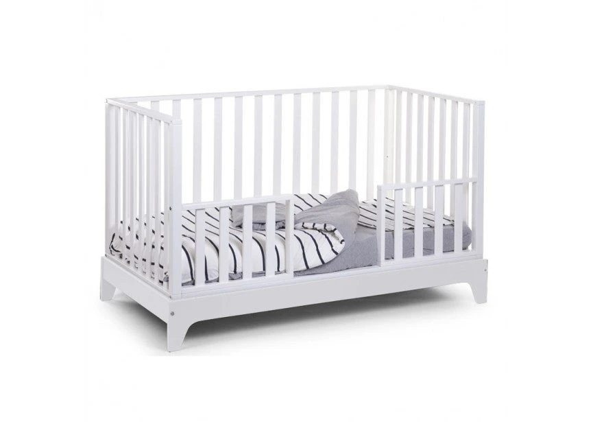 In the beginning, your baby sleeps in the closed bed with 4 slatted sides. As your child gets older, the bed can transition to the next step by removing a slatted side and replacing it with the half open side that is included. This half open side functions as a bed rail and prevents your toddler from falling out of his bed during the night. Once the toddler is used to sleeping in an open bed, the half open side can be removed. In the final stage, all slatted sides can be removed. Once your child has outgrown the bed, the bed can easily become a first sofa. Just ad a few comfy pillows and you can enjoy the sofa for years to come.