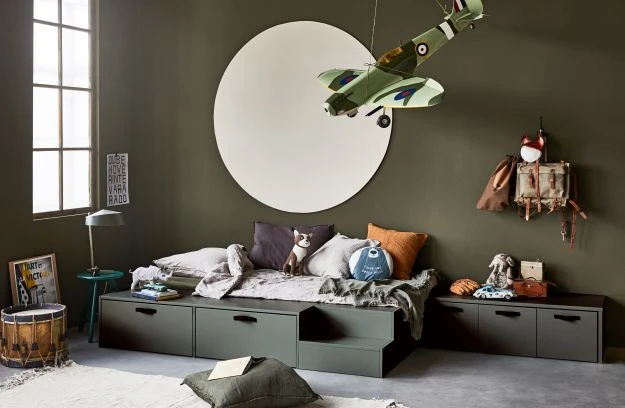 This Stage bed (80×200 cm) from the collection of the Dutch brand vtwonen is robust and sturdy. The bed is made of solid, FSC certified, pine lacquered in a green soap tint. The two extra matching bed drawers with brown leather handles make Stage complete. Extra storage space in a children’s room is always a good idea.