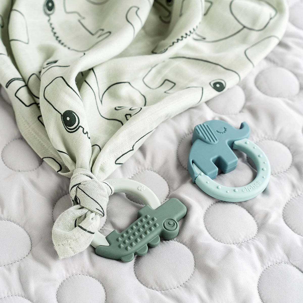 The teether set is designed to fit even the tiniest hand and stimulates both the visual, oral, and tactile senses of the baby. Shades of soft blue and green, fun textures, and the cute elephant and fun crocodile make this set the perfect first toy.