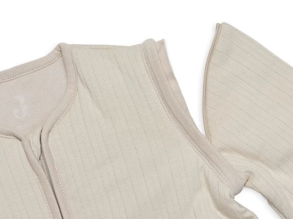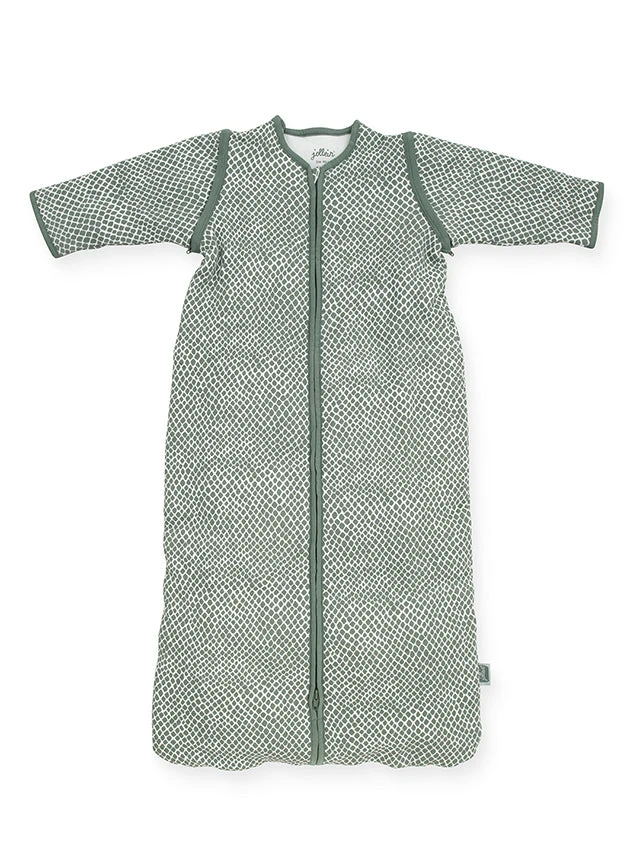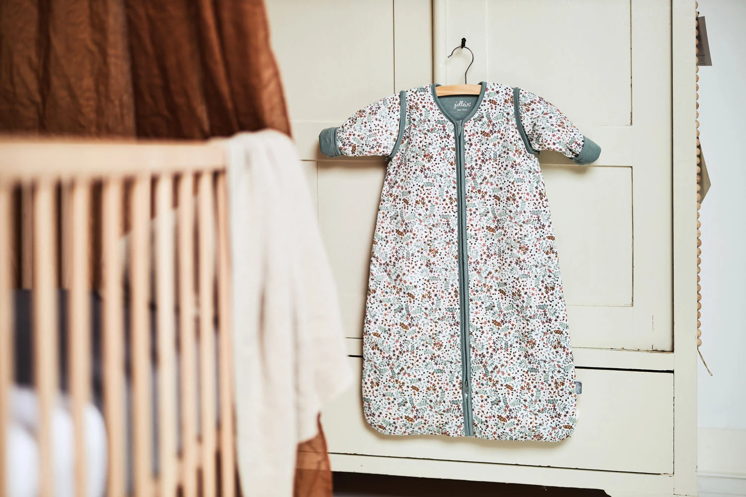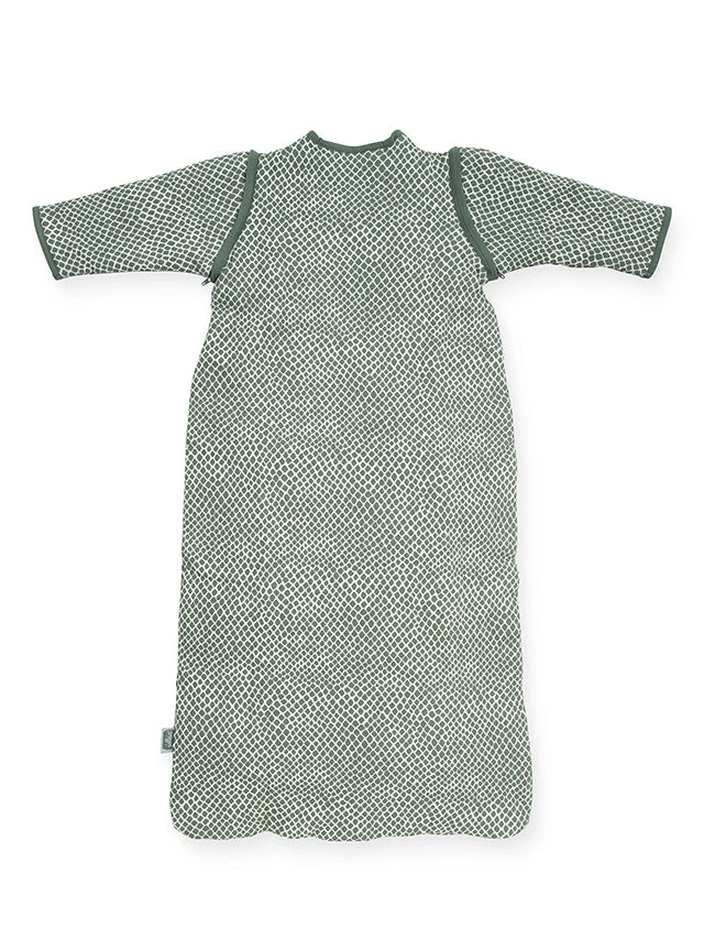 Beautiful sleeping bag with detachable sleeves from Jollein. The baby sleeping bag has detachable sleeves and a TOG value of 2.0. The sleeping bag is available in green and pink in the sizes 70 cm, 90 cm and 110 cm. The sleeping bag is made of cotton and lined with polyester fiberfill.