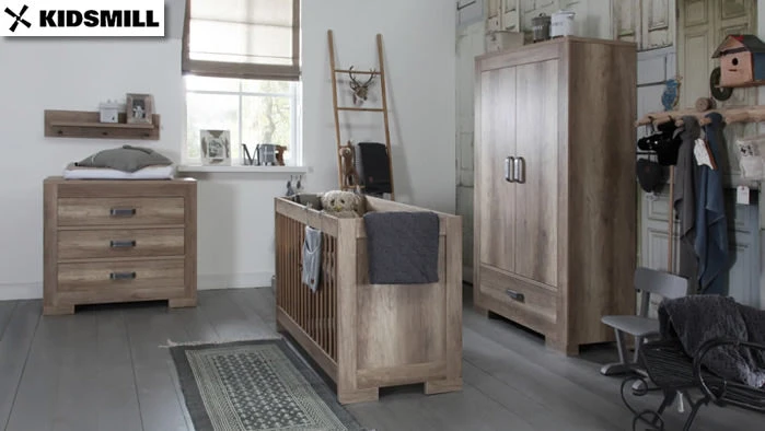 There are endless possibilities with the Kidsmill Lodge nursery furniture collection. This baby room is available with wardrobes and cots in various sizes so that you can put together a room that fits the space you have available. In addition, items for a cool teen room are also available in this series.
