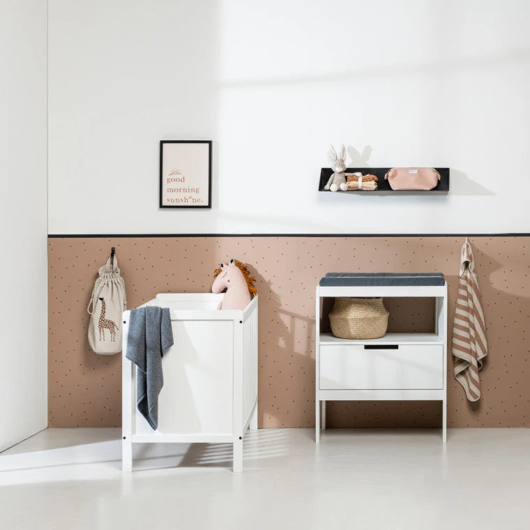With this practical Europe Baby Ralph Commode Matt White you are fully prepared for changing your baby and you have all the essentials at hand. The chest of drawers has 1 spacious drawer in which you can store a lot and 1 open shelf. You can perfectly place a changing pad on the top. Furthermore, the chest of drawers is made of high-quality MDF and meets the European safety standard.