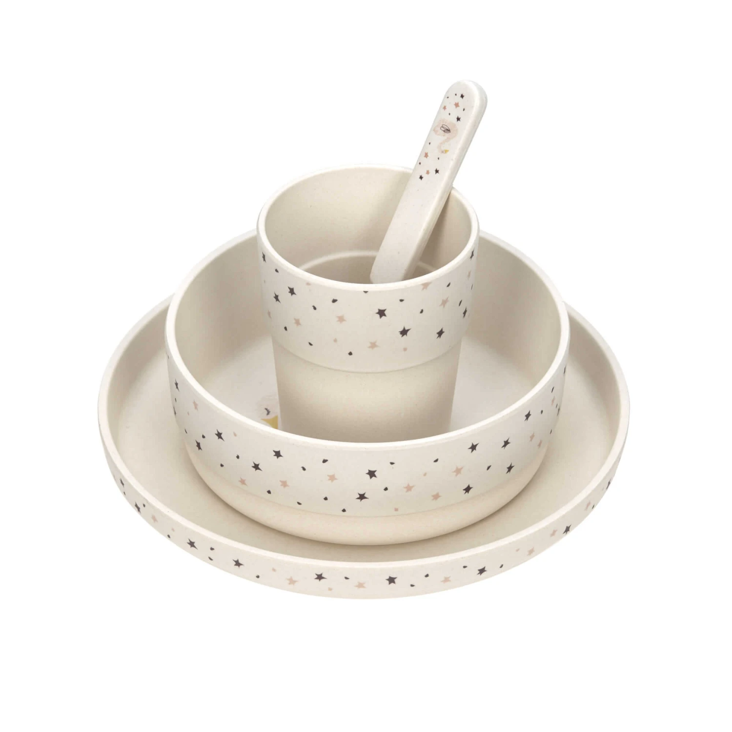 The set is made mainly from the renewable, sustainable raw materials bamboo and corn and includes a certain amount of melamine. Perfectly suitable for children from 12 months and up.