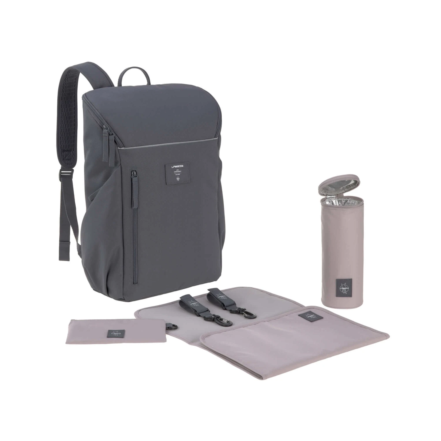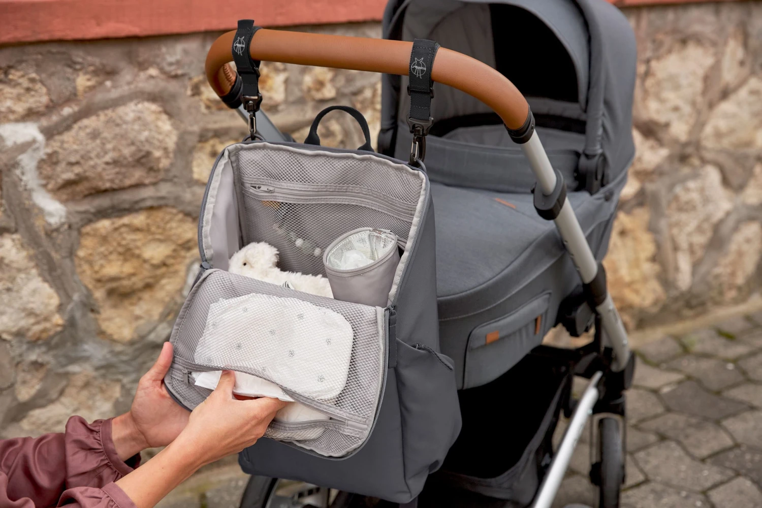 In addition to its large main compartment, the Slender Backpack offers many other useful compartments and practical diaper changing accessories. The water-repellent compartment on the front of the backpack is ideal for stashing damp clothing away until you get home. Meanwhile, drinking bottles, keys and other valuables are safely stowed away in the angled side pockets. Equipped with a water-repellent changing mat, an insulated bottle holder, a holder for food jars, a stroller attachment and a pocket for small items, you have everything you need when you and your baby are out and about.