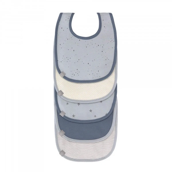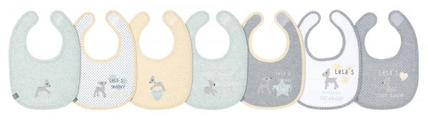 The bibs that are sold in multiple assortments have a Velcro fastener on the reverse side and are made of easy-care cotton and feature a waterproof interior lining to keep baby’s clothing underneath absolutely dry. The set of five is available in various colors, with and without pattern. Suitable for babies and small children from 3 to 18 months.