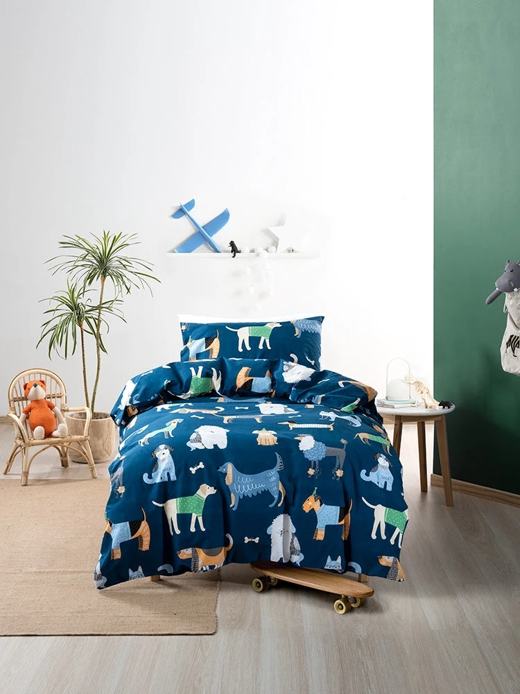 Woof woof! The cutest canine pals for your little one, Dog Days features an array of dog breeds wearing party hats and glasses on a navy base. With the same print on the front and reverse, this design will be a fun addition to any dog-lovers bedroom.