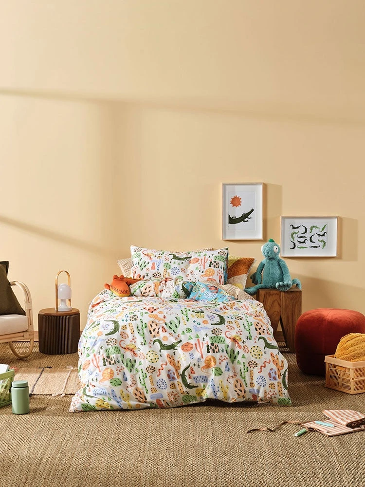 Rawrrr! Everyone’s favourites, the big cats, come to life in this thrilling print on cotton percale. Illustrated with crayon in a contemporary style and colour palette, this striking set is trimmed with cord piping and is fully reversible to your little cub’s delight