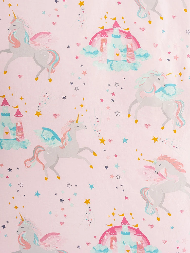 Ignite your little one’s imagination with this divine design. The magical pegasus is flying and prancing amongst watercolour castles, hearts and shooting stars in vibrant hues on a soft pink ground. This design is printed on cotton with the same design front and reverse.