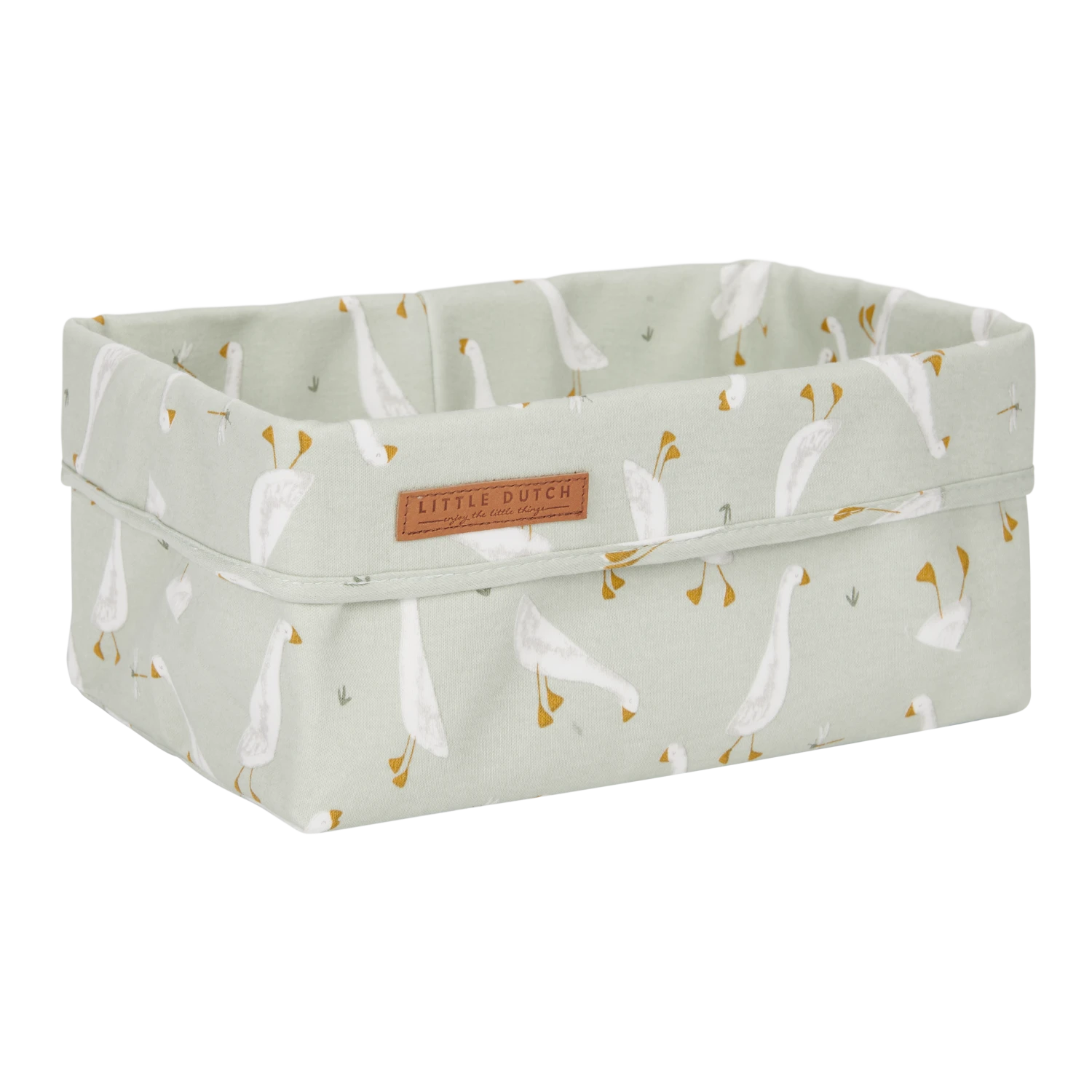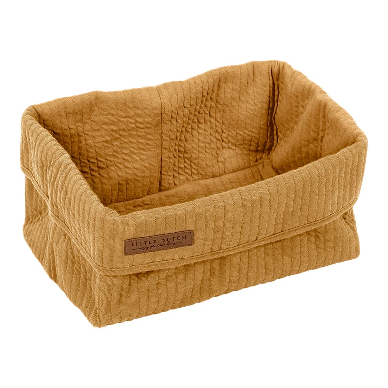 A handy storage basket for diapers, bottles, tubes and more. This Little Dutch Sunrise Ochre nursery basket is made of cotton and has the color ochre yellow and a white ‘sunrise print’. Furthermore, the fabric basket is rectangular and has a size of 25 x 15 x 15 cm.