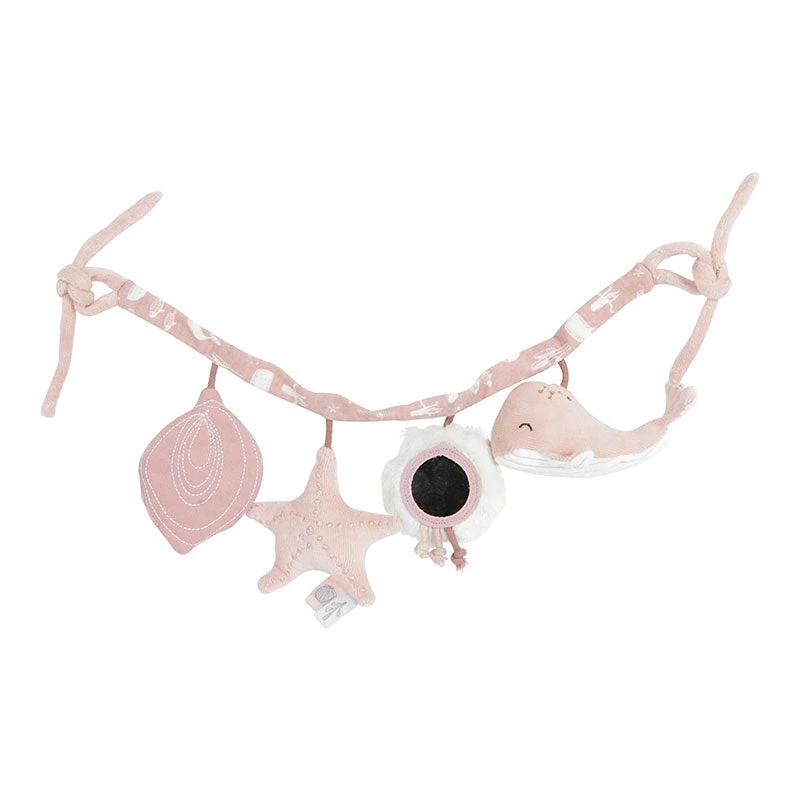 This Little Dutch stroller tensioner from the Ocean collection is easy to attach to a car seat or pram and provides lots of fun and entertainment along the way thanks to the toys with a rattle, mirror, pinch horn and crackle. Also stimulates hand-eye coordination. Â