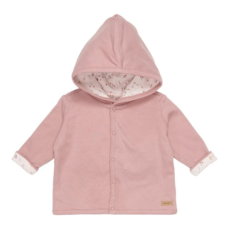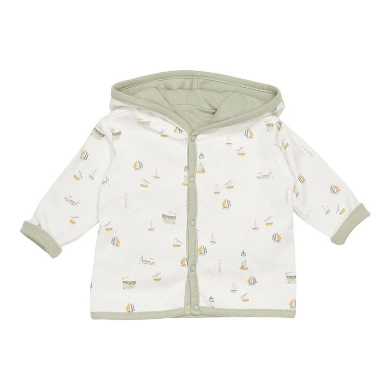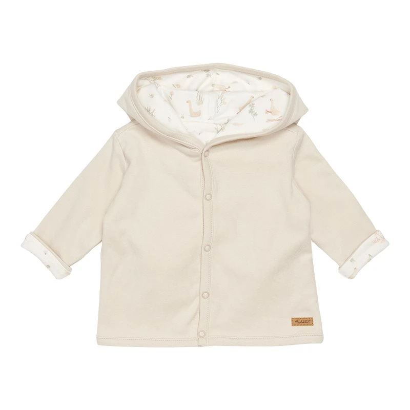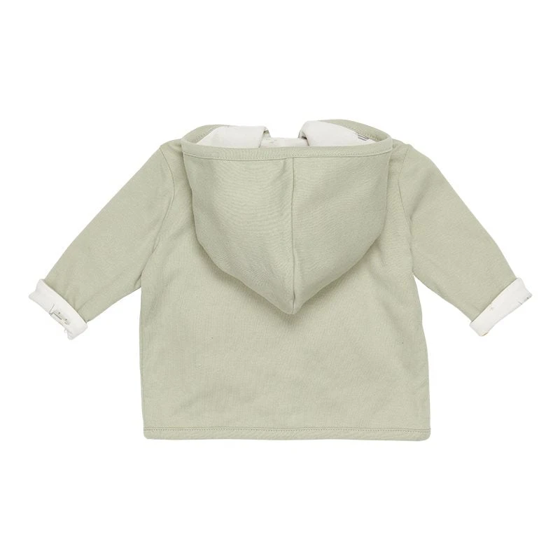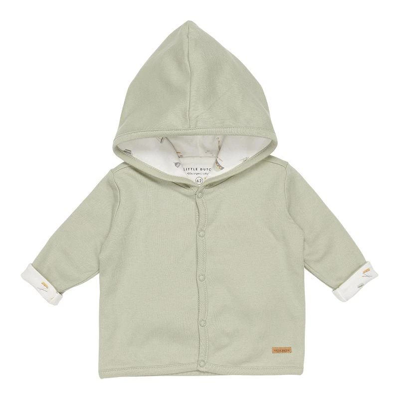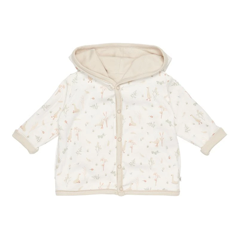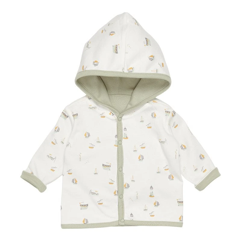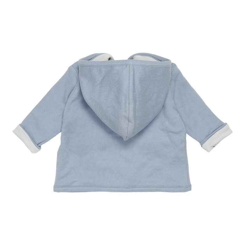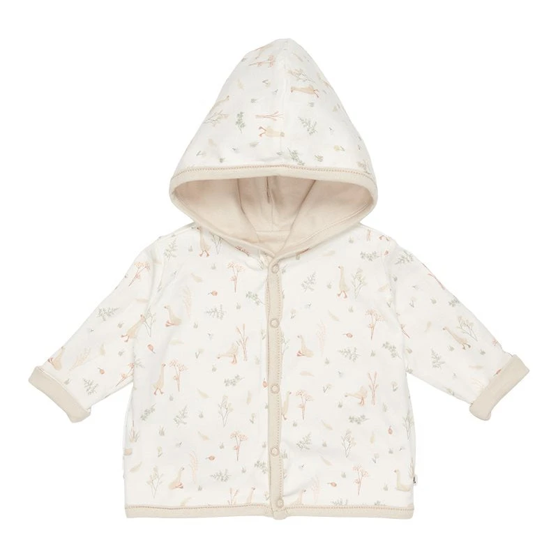 Keep your baby warm in this reversible jacket made from certified organic cotton. This comfy style can be worn in two ways. One side is rendered in a color hue, while the other side features our signature print. The jacket has a hood and a front opening that easily fastens with five buttons. Complete with a cap on colder days.