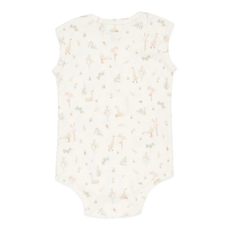 This pond-inspired bodysuit makes for a playful iteration of the classic style. Sprinkled throughout with walking and swimming geese, it adds a fun twist to your baby’s day-to-day rotation. This body is cut from certified organic cotton to a sleeveless silhouette with a crotch opening and snap buttons.