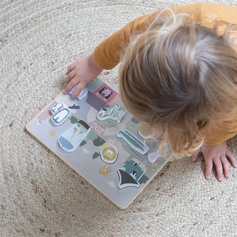 Discover the Zoo with the Little Dutch shape puzzle. The wooden puzzle consists of 9 wooden puzzle pieces. The cheerful puzzle improves hand-eye coordination and the puzzle pieces are comfortable to hold for little hands. Next to that, the puzzle pieces are also fun to play with, because they can stand upright.