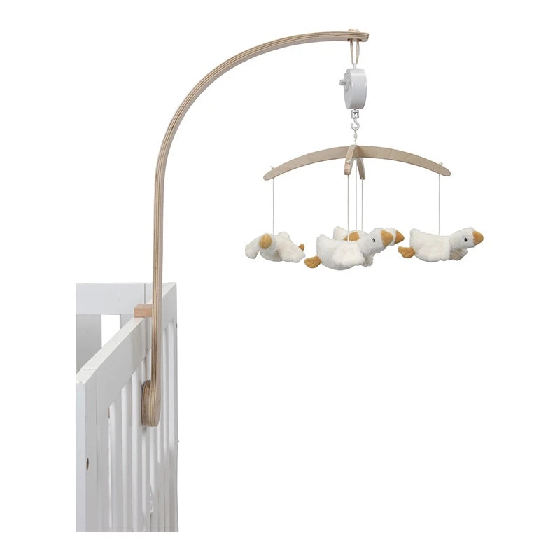 This beautiful wooden Little Goose music mobile has a soothing effect on babies thanks to the sweet lullaby. Four goslings hang from the mobile that love to fly in circles to entertain your baby. Babies like to watch the movement of these toys, which stimulates their visual development. The music mobile is suitable from birth and easy to attach to the cot or playpen.