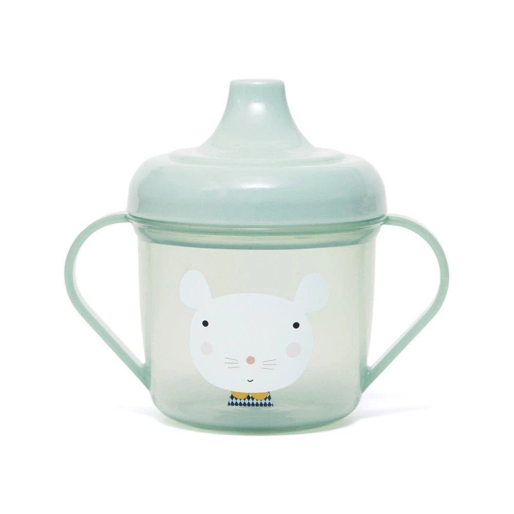 Transparent training cup bear with a screw lid and a spout. The cup has two handles to hold the cup. Cup holds 190 ml – 6,4 oz, tritan bottle + PP lid. Dishwasher proof not suitable for microwave.