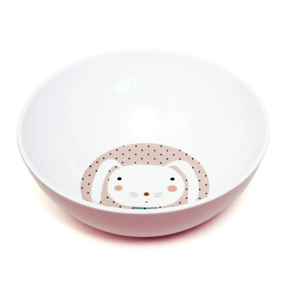 We love this new large sized melamine bowl rabiit drops, print at inside bottom and soft powder pink plain color outside.