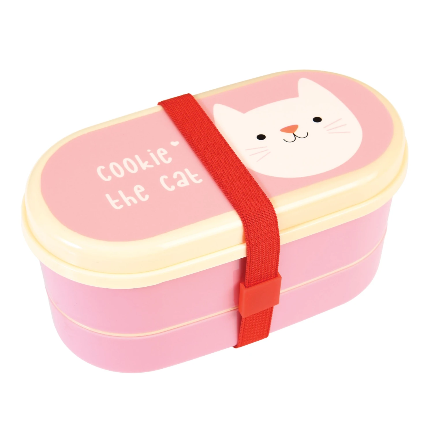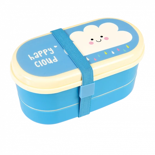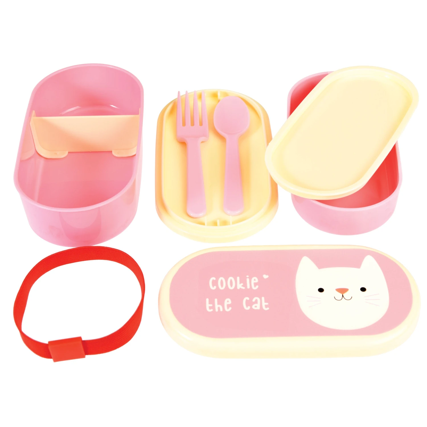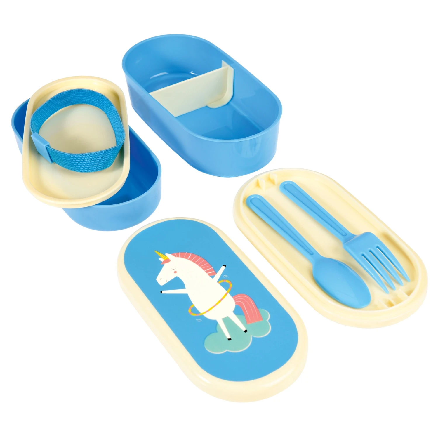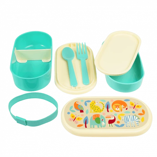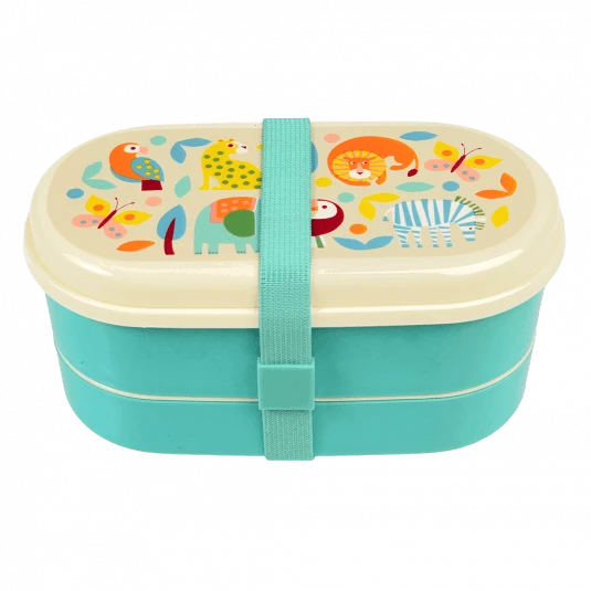Kids will love this dual compartment bento box with fork, spoon, elastic strap.