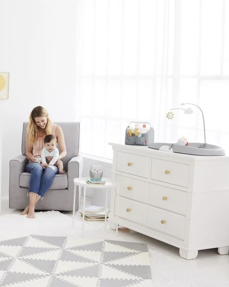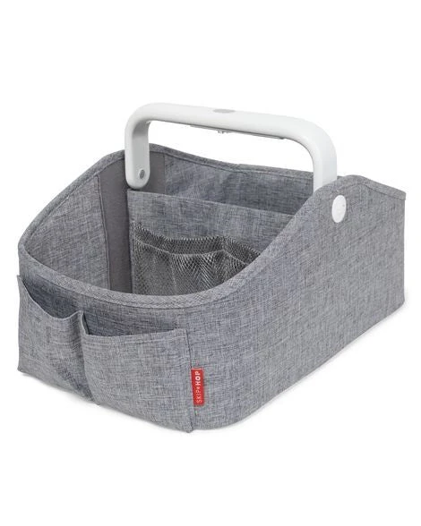 Shed some light on middle-of-the-night diaper changes with our modern diaper caddy! The handle shines softly with a touch sensitive light and a 10 minute auto-off feature. Organize diapers, wipes and more with a modular divider and four pockets.