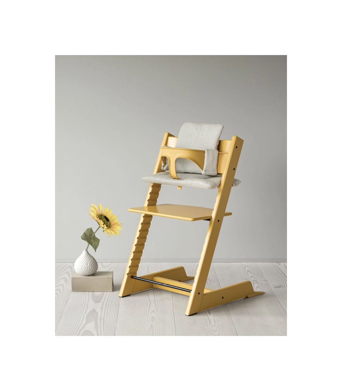 At around six to nine months, your baby will be able to start sitting upright unaided. The Baby Set, used with the Tripp Trapp high chair has a high back support and rail with an integrated crotch strap which lets your baby sit securely and comfortably at the table.